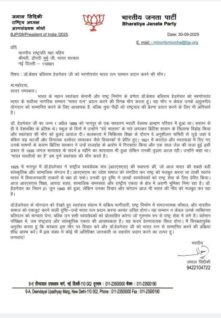 राष्ट्रपति द्रौपदी मुर्मू को संबोधित पत्र में जमाल सिद्दीक़ी के लिखा है कि भारत के महान स्वतंत्रता सेनानी और राष्ट्र निर्माण के प्रणेता डॉ. केशव बलिराम हेडगेवार को मरणोपरांत भारत के सर्वोच्च नागरिक सम्मान ‘भारत रत्न’ प्रदान करने की विनम्र मांग करता हूं। यह मांग न केवल उनके अतुलनीय योगदान को सम्मानित करने के लिए आवश्यक है, बल्कि युवा पीढ़ी को राष्ट्रवाद की प्रेरणा प्रदान करने के लिए भी अनिवार्य है।