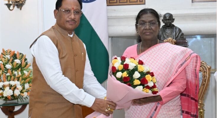 Chhattisgarh CM IN Delhi: नई दिल्ली, 6 अक्टूबर 2025- छत्तीसगढ़ के मुख्यमंत्री विष्णुदेव साय ने नई दिल्ली स्थित राष्ट्रपति भवन में राष्ट्रपति श्रीमती द्रौपदी मुर्मू से सौजन्य भेंट की। यह मुलाक़ात सौहार्दपूर्ण और सार्थक रही।