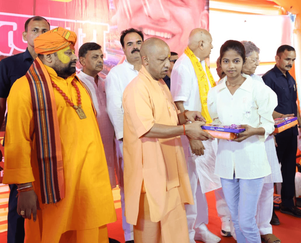 CM Yogi personally distributed sweets, fruit baskets, and gifts door-to-door in Matgaid Mohalla, Ward No. 31 Devkali, and Kandharpur (Manjhi Nagar) Nishad Basti (Ward No. 1 Abhiram Das). Children were delighted as he handed out chocolates, toffees, and sparklers.