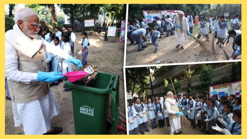 पीएम मोदी ने स्कूली बच्चों के साथ सफाई करते हुए तस्वीर साझा किया और सभी से स्वच्छता अभियान का हिस्सा बनने के लिए आगरा भी किया । प्रधानमंत्री मोदी ने तस्वीरों को साझा करते हुए लिखा है कि गांधी जयंती पर आज अपने युवा साथियों के साथ स्वच्छता अभियान का हिस्सा बना। मेरा आप सभी से आग्रह है कि आप भी अपने आसपास स्वच्छता से जुड़ी मुहिम का हिस्सा जरूर बने आपकी इस पहल से स्वच्छ भारत की भावना और मजबूत होगी उन्होंने स्वच्छता भारत के 10 साल पर भी काफी कुछ लिखा है।