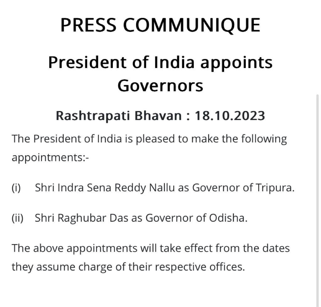 Governor Appointment: झारखंड के पूर्व मुख्यमंत्री रघुवर दास को उड़ीसा का राज्यपाल नियुक्त किया गया वहीं इंद्रसेना रेड्डी नल्लू को त्रिपुरा का राज्यपाल बनाया गया है। राष्ट्रपति भवन ने बयान जारी कर यह जानकारी दी है। आगे कहा गया है कि द्रौपदी मुर्मू ने यह नियुक्तियां की है दोनों पदों पर नियुक्ति उसे तारीख से प्रभावित होगी जब रघुवर दास और लालू अपने-अपने कार्यभार संभालेंगे।