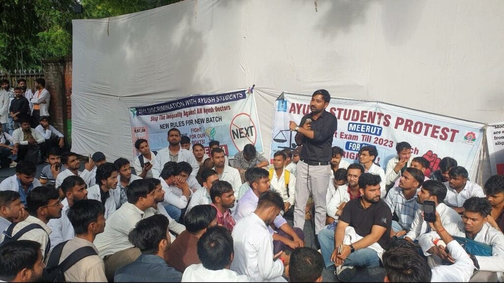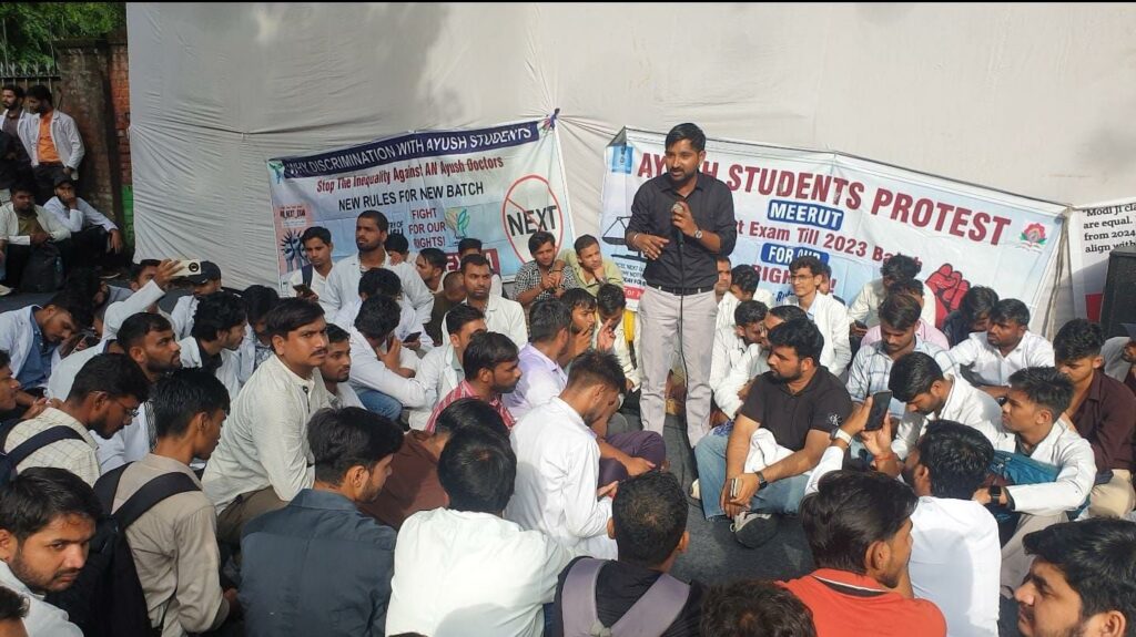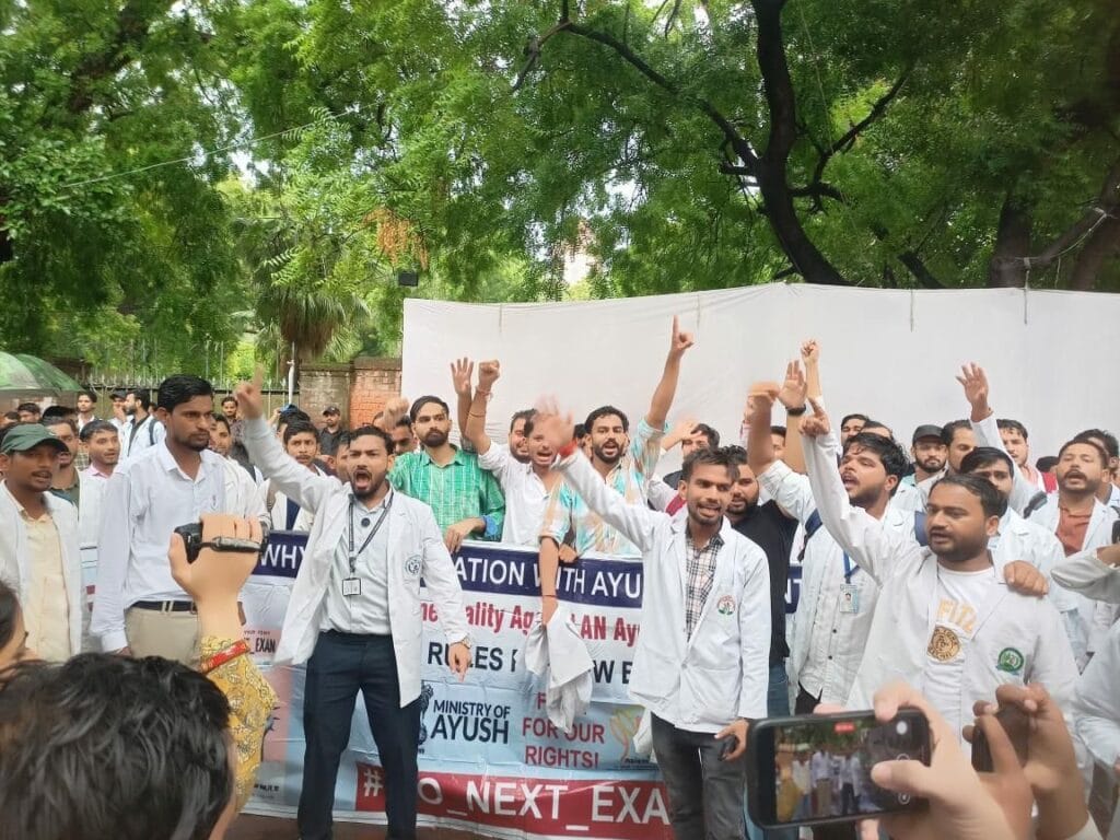 इस सौतेले व्यवहार को लेकर सभी छात्र-छात्राओं ने विनम्र सिंह की अध्यक्षता में जंतर-मंतर पर तीन धरने पहले भी रखे हैं जिसमें पहला धरना पिछले वर्ष अक्टूबर व दूसरा धरना दिसम्बर माह में था और तीसरा धरना इसी वर्ष जनवरी के माह में आयोजित किया गया था। तीन धरनो के बाद जून माह में आयुष मंत्री जी का बयान एक प्रतिष्ठित न्यूज चैनल के माध्यम से जारी हुआ था कि नेक्स्ट एग्जाम परीक्षा 2022 बैच तक हटा दी गई है लेकिन सितंबर के माह में 9 तारीख को मंत्रालय द्वारा एक पत्र जारी किया जाता है जिसमें यह दर्शाया जाता है कि एक्जिट परीक्षा 2021 बैच से ही लागू की जाएगी। आयुष मंत्री जी से बात करने पर यह पता चलता है कि उनके द्वारा धोखे से या गलती से ऐसा बयान दे दिया गया। जिसके बाद सभी छात्र-छात्राओं ने फिर से विनम्र सिंह के नेतृत्व में चौथा धरना प्रदर्शन किया और अपनी मांगों को लेकर नई दिल्ली के जंतर-मंतर पर आवाज उठाई। खराब मौसम व भीषण बारिश में भी हजारों छात्र-छात्राओं ने धरना स्थल पर रूककर भीगते हुए अपनी आवाज को उठाने का काम किया।