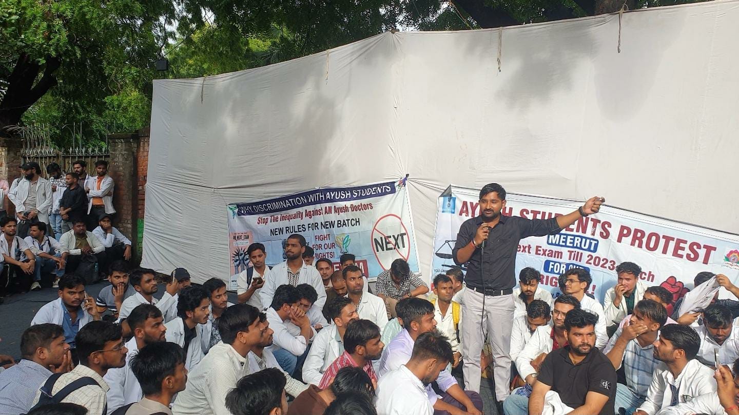 इस सौतेले व्यवहार को लेकर सभी छात्र-छात्राओं ने विनम्र सिंह की अध्यक्षता में जंतर-मंतर पर तीन धरने पहले भी रखे हैं जिसमें पहला धरना पिछले वर्ष अक्टूबर व दूसरा धरना दिसम्बर माह में था और तीसरा धरना इसी वर्ष जनवरी के माह में आयोजित किया गया था। तीन धरनो के बाद जून माह में आयुष मंत्री जी का बयान एक प्रतिष्ठित न्यूज चैनल के माध्यम से जारी हुआ था कि नेक्स्ट एग्जाम परीक्षा 2022 बैच तक हटा दी गई है लेकिन सितंबर के माह में 9 तारीख को मंत्रालय द्वारा एक पत्र जारी किया जाता है जिसमें यह दर्शाया जाता है कि एक्जिट परीक्षा 2021 बैच से ही लागू की जाएगी। आयुष मंत्री जी से बात करने पर यह पता चलता है कि उनके द्वारा धोखे से या गलती से ऐसा बयान दे दिया गया। जिसके बाद सभी छात्र-छात्राओं ने फिर से विनम्र सिंह के नेतृत्व में चौथा धरना प्रदर्शन किया और अपनी मांगों को लेकर नई दिल्ली के जंतर-मंतर पर आवाज उठाई। खराब मौसम व भीषण बारिश में भी हजारों छात्र-छात्राओं ने धरना स्थल पर रूककर भीगते हुए अपनी आवाज को उठाने का काम किया।