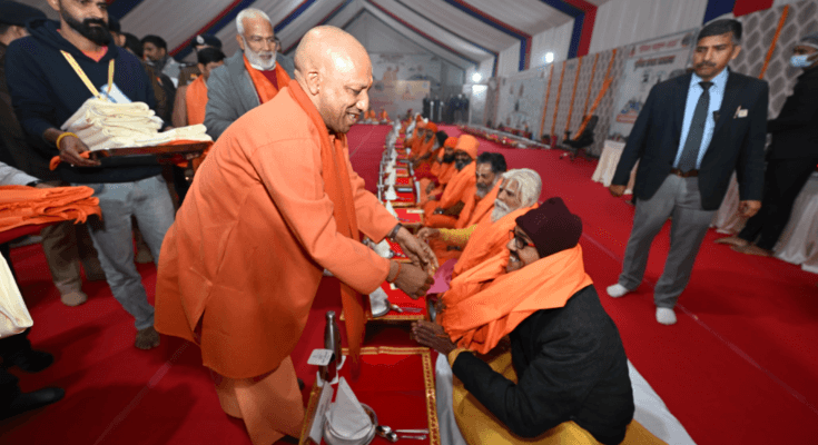 सीएम योगी को अपने बीच पाकर प्रफुल्लित हुए साधु संत, वैदिक मंत्रोच्चार और पुष्प वर्षा से किया स्वागत