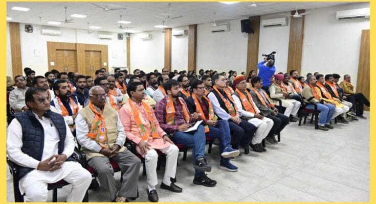 Rajasthan BJP Office: जयपुर, 19 जनवरी 2025- भाजपा प्रदेश कार्यालय में आज ‘‘मन की बात‘‘ कार्यक्रम की 118वीं कड़ी का लाइव प्रसारण सुना गया। भाजपा संगठन पर्व प्रदेश संयोजक नारायण पंचारिया की उपस्थिति में भाजपा पदाधिकारियों के साथ कार्यकर्ताओं ने प्रधानमंत्री नरेंद्र मोदी के कार्यक्रम को ध्यान पूर्वक सुना। इस दौरान संगठन पर्व के प्रदेश सह प्रभारी हरिराम रणवां, भाजपा प्रदेश कार्यालय प्रभारी मुकेश पारीक, भाजपा प्रवक्ता नरेंद्र कटारा, मनीष सिसोदिया सहित कई पदाधिकारी एवं कार्यकर्ता उपस्थित रहे।