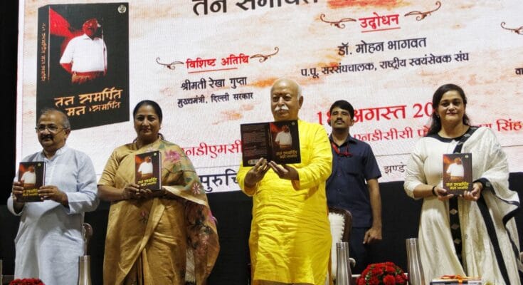 Tan Samarpit Man Samarpit Book:नई दिल्ली के एनडीएमसी कन्वेंशन सेंटर में स्वर्गीय रमेश प्रकाश के जीवन और योगदान को समर्पित उनकी जीवनी प्रधान पुस्तक “तन समर्पित, मन समर्पित” का अत्यंत ही मार्मिक और प्रेरक लोकार्पण हुआ। इस कार्यक्रम में राष्ट्रीय स्वयंसेवक संघ (आरएसएस) के सरसंघचालक डॉ. मोहन भागवत जी, दिल्ली की मुख्यमंत्री