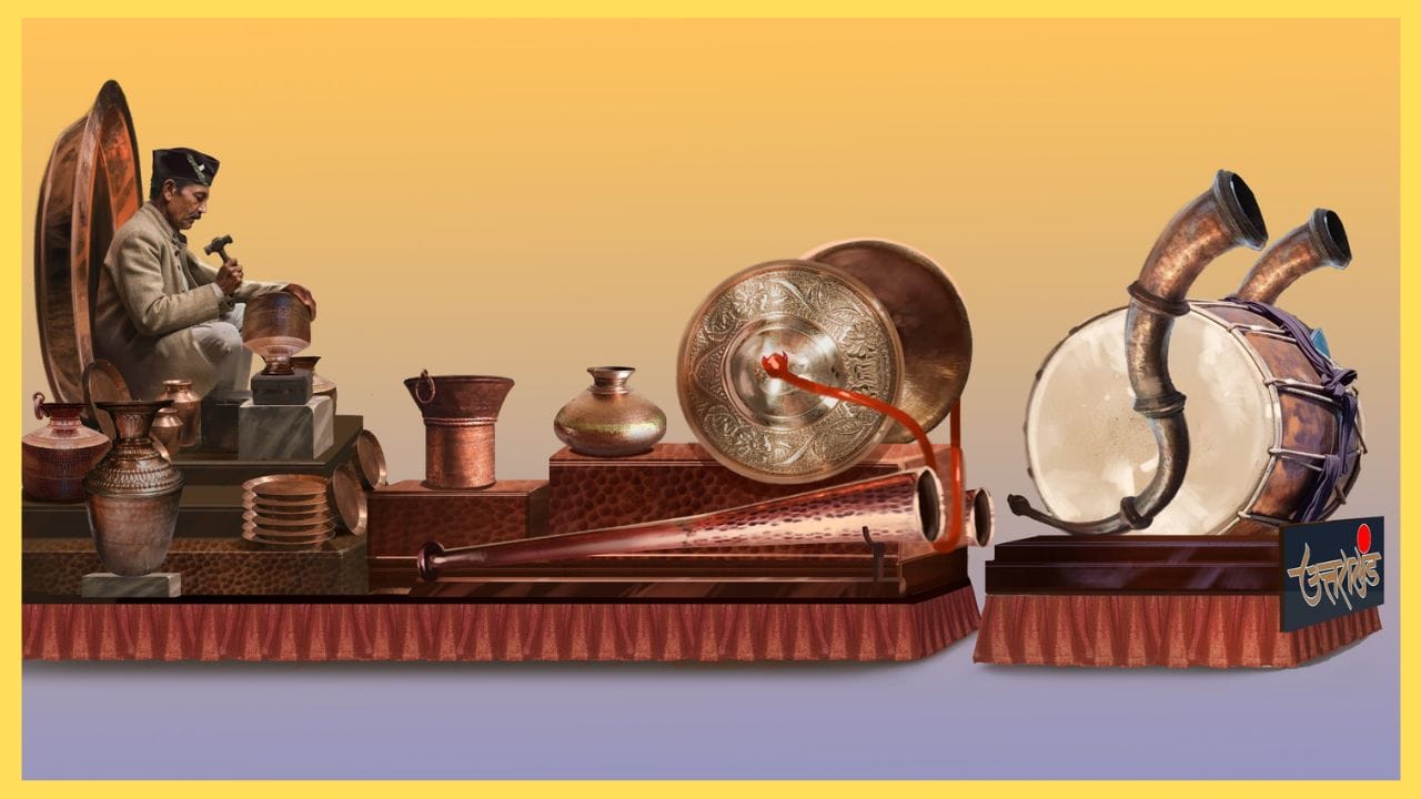 ट्रेलर सेक्शन के पहले भाग में तांबे के मंजीरे की एक बड़ी मूर्ति दिखायी गई है, जो तांबे की कला की बारीकियों को विस्तार से उजागर करती है। बीच का सेक्शन खूबसूरती से बनाए गए तांबे के बर्तन जैसे गागर, सुरही, कुण्डी को दर्शाया गया है, जो उत्तराखण्ड के पारंपरिक घरेलू जीवन के आवश्यक तत्व हैं। इस सेक्शन के नीचे, साइड पैनल पारंपरिक वाद्ययंत्र भोंकोर के प्रमुख चित्रणों से सजाए गए हैं, जो सांस्कृतिक कहानी को और समृद्ध करते हैं।