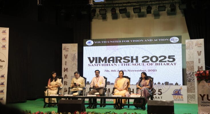 नई दिल्ली, 09 नवम्बर 2025 — यूथ यूनाइटेड फॉर विजन एंड एक्शन (YUVA) द्वारा आयोजित तीन दिवसीय राष्ट्रीय संवाद “विमर्श 2025” का समापन दिल्ली विश्वविद्यालय के कमला नेहरू कॉलेज में सफलतापूर्वक संपन्न हुआ। समापन सत्र का विषय था “संवैधानिक द्वंद्व: सांस्कृतिक मार्क्सवाद के संदर्भ में चुनौतियाँ और समाधान”, जिसमें देशभर के प्रबुद्ध चिंतक, शिक्षाविद् और युवा प्रतिनिधि शामिल हुए। सत्र की शुरुआत डॉ. प्रतिभा त्रिपाठी जी के संबोधन से हुई, जिन्होंने तीन दिवसीय विमर्श की प्रमुख चर्चाओं का सार प्रस्तुत किया और इसे “युवा विचारों के संवाद और राष्ट्र निर्माण की भावना का प्रतीक” बताया।